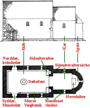 Snit gennem en romansk kirke, set mod alteret (mod øst)